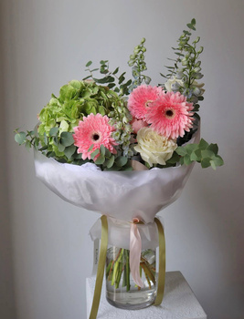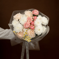 Bukiet róż czerwonych i brzoskwiniowych z goździkami
